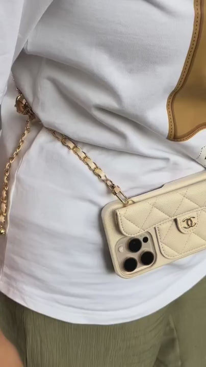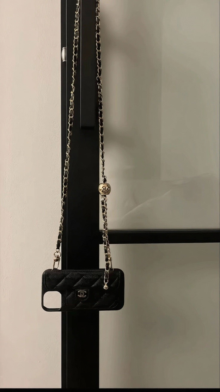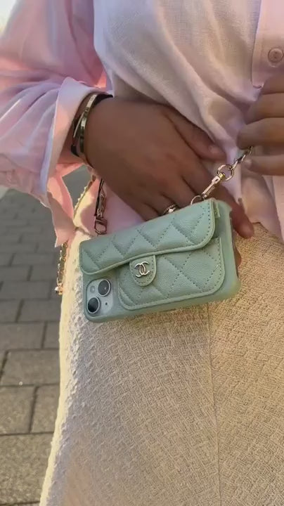 Apporte une touche de luxe à ton téléphone avec cette coque iPhone façon mini sac matelassé. Coque en cuir avec une chaîne dorée entrelacée, et le logo CC iconique pour un style chic et tendance.